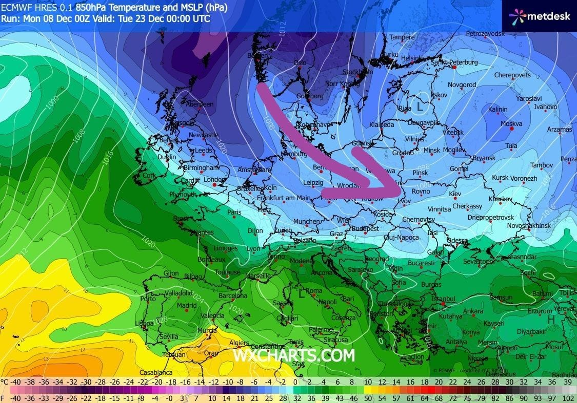 Na takéto vzdialené obdobie aktuálne vidia len dlhodobé numerické modely, ktoré už niekoľko dní avizujú zvrat. Cez Severné a Baltské more by sa nad Pobaltie mala dostať tlaková níž, čo by umožnilo zatečenie chladného vzduchu do Európy.