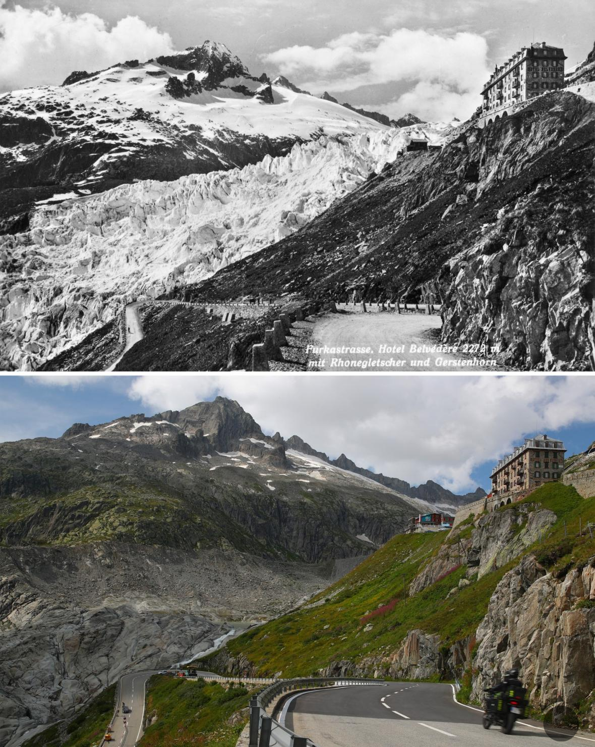 Hotel Belveder bol takisto ešte v roku 1938 obklopený ľadovcom Rhône. Ten už takmer úplne zmizol a na príjemnú zimnú scenériu môžu už len spomínať.