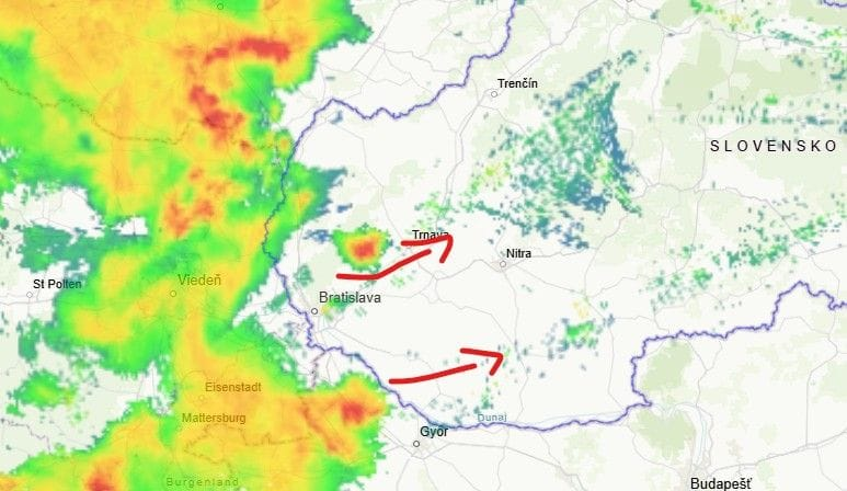 Zatiaľ čo v oblasti Trnavy sa vyskytuje prvá búrka, tak ďalšia búrka smeruje zo severozápadného Maďarska do oblasti Dunajskej Stredy. Táto búrka má potenciál priniesť aj väčšie krúpy. Dnes to však nebude o lejaku a bleskoch.