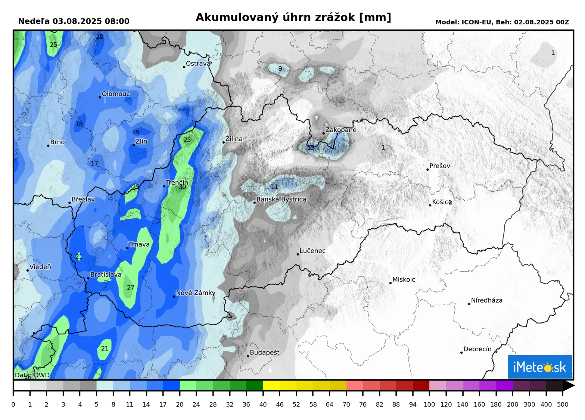 Ako vidieť aj na mape očakávaných zrážok na uplynulé hodiny, tak najviac zrážok spadne na západnom a severozápadnom Slovensku, kde by búrky mohli priniesť až okolo 30 mm zrážok. Lejak tak bude najčastejším sprievodným javom.