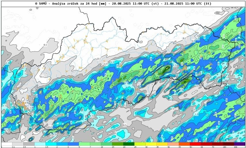 Najviac zrážok za uplynulé hodiny eviduje stanica Štós-kúpele v okrese Košice, kde spadlo 30,8 mm. Druhou najupršanejšou lokalitou je Detvianska Huta s 24 mm a treticu uzatvára obec Obišovce s 23,4 mm. Všetky najupšanejšie lokality sa nachádzajú v Banskobystrickom a v Košickom kraji, čo vidieť aj na mape zaznamenaných zrážkových úhrnov.