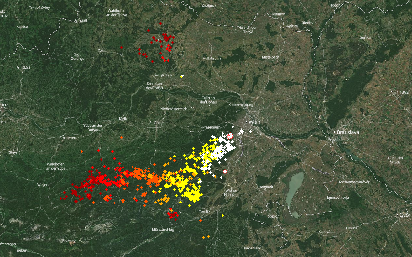 Blížiaci sa studený front prináša rozsiahlu zrážkovú činnosť. Najzaujímavejšie a zároveň najnebezpečnejšie je, že v oblasti východného Rakúska sa tvoria búrky, ktoré sú už teraz miestami intenzívne.