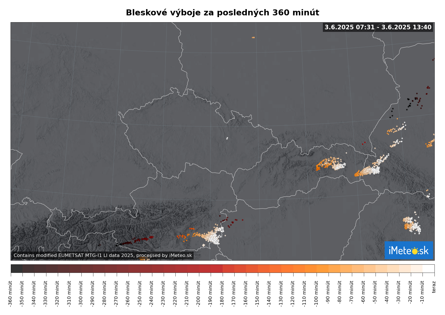 Takto vyzerá zatiaľ dnešná blesková aktivita nad Slovenskom. Búrky sa však len teraz zažínajú rozbiehať, takže počet bleskov nad východným Slovenskom bude dnes opäť počítať v tisícoch.