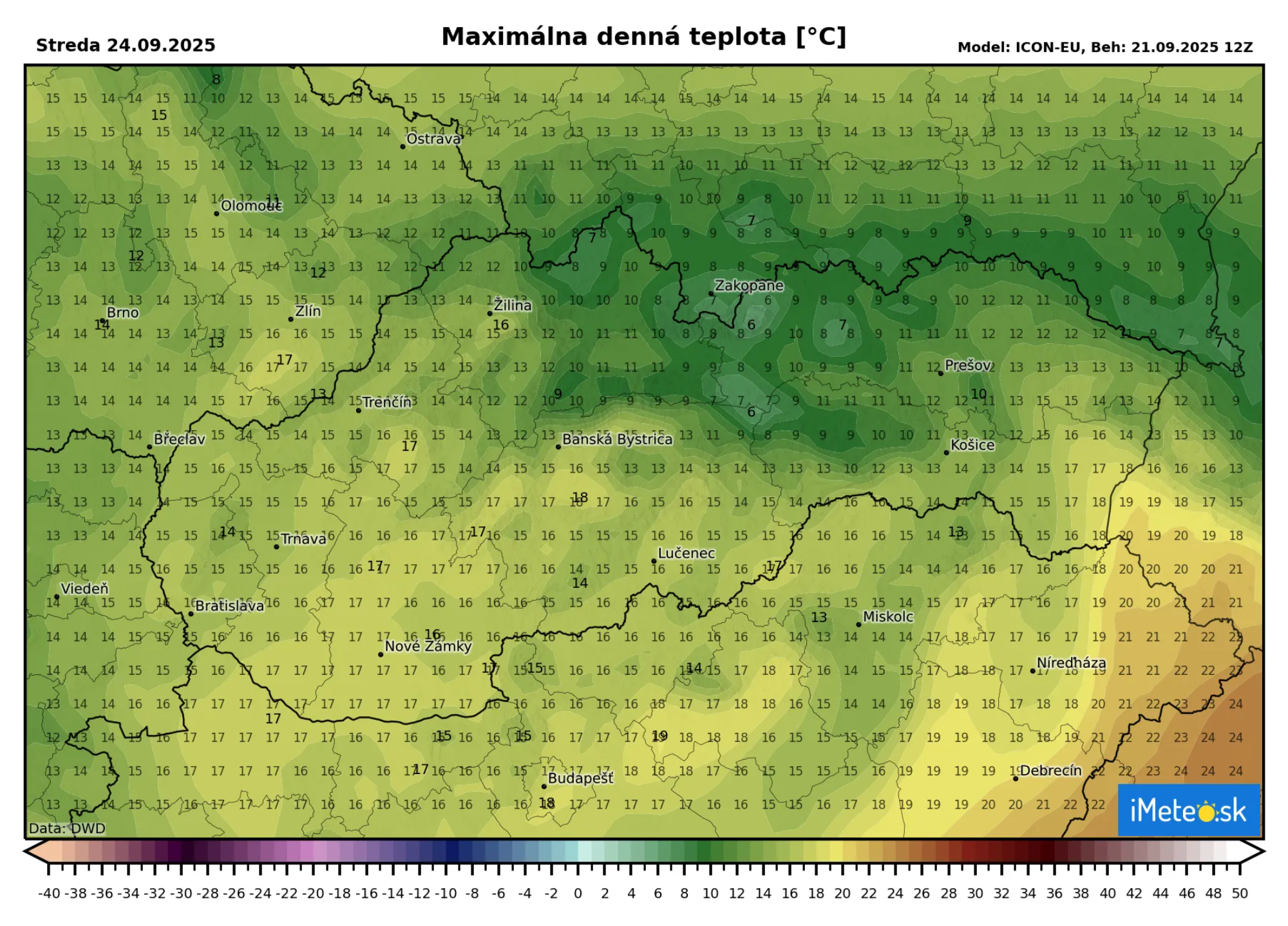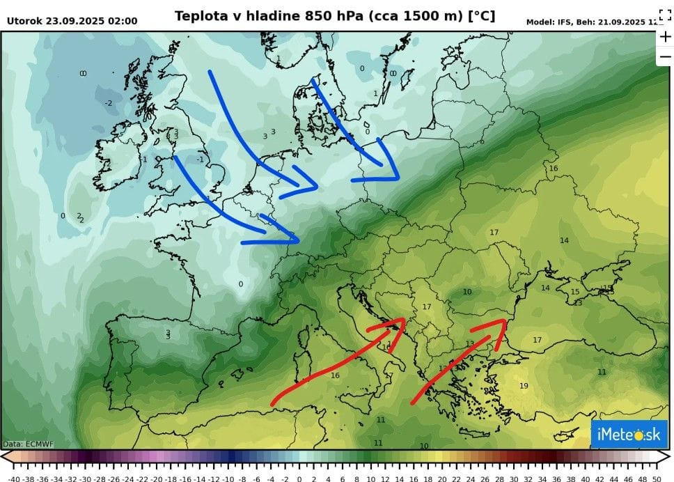 V stredu sa príliv studeného vzduchu zintenzívni a oproti dnešnému dňu bude chladnejšie o zhruba 12 °C. Maximálne teploty sa vyšplhajú len na +11 až +18 °C. Dnes teda bude ešte od +24 do +30 °C, no v stredu už len od +11 do +18 °C, a to je poriadna teplotná zmena.