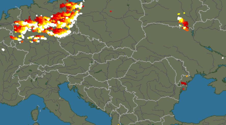 Studený front už postupuje cez západnú Európu, kde prináša intenzívne búrky. Najintenzívnejšia búrková činnosť je aktuálne v Nemecku, avšak postupne sa presunie aj do susedného Česka, pričom búrky sú už doslova na hraniciach medzi Nemeckom a Českom.