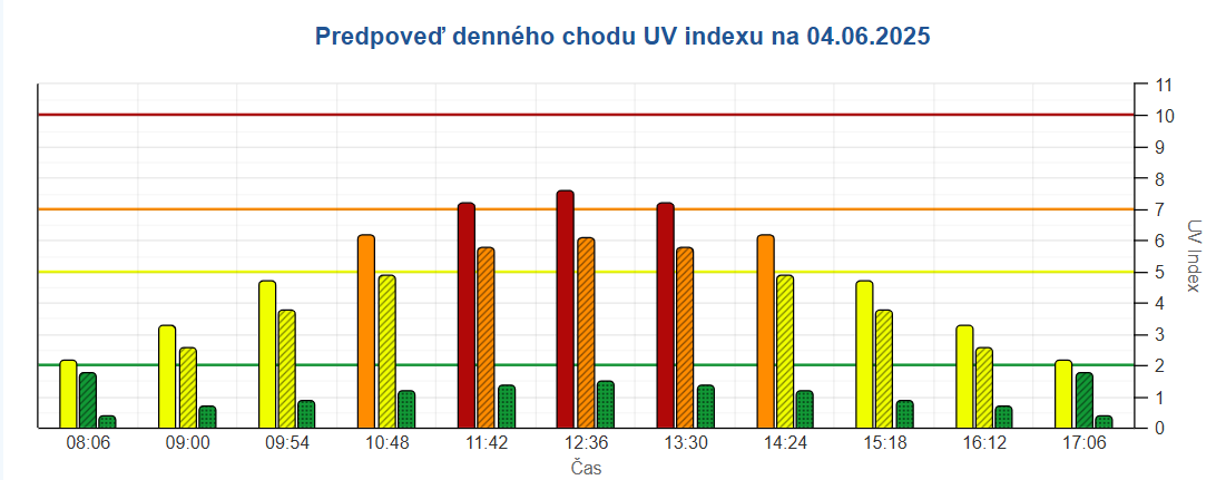 Pri najvyšších UVI hodnotách v poludňajších hodinách medzi 10:00 h až 15:00 h sa treba vyhnúť pobytu vonku alebo sa zdržiavať v tieni.