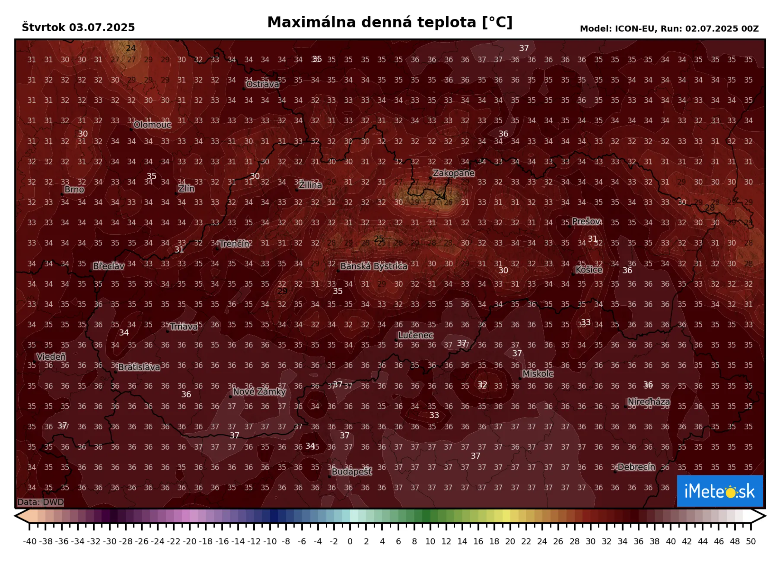 Teploty ľahko prekonajú supetropické teploty +35 °C a budú sa šplhať až k +38 °C, lokálne môže byť aj viac. V našej oblasti zajtra vyvrcholí príliv vzduchu pôvodom z Afriky, ktorý bude v strednej Európe atakovať teploty na úrovni hranice +40 °C.