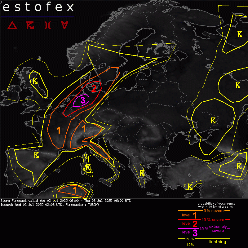 Pre severovýchodné Francúzsko až po juhovýchodné Dánsko bol vydaný 2. stupeň výstrahy, rovnako kvôli silným nárazom vetra. Hrozí tu dnes aj veľké krupobitie. Estofex varuje pred búrkami aj v Alpách a v oblasti až po juhovýchodné Francúzsko a Taliansko, najmä kvôli krupobitiu, silným až ojedinelým silným nárazom vetra a silnému dažďu.