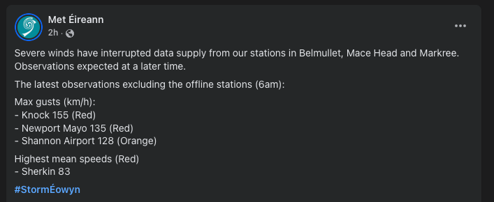 Meteorologické stanice v Írsku pre mohutnú víchricu Éowyn čelia výpadkom elektrického prúdu, na mnohých miestach preto chýbajú údaje o sile nárazov vetra. Podľa amatérskych staníc však už mohli dosiahnuť 200 km/h.