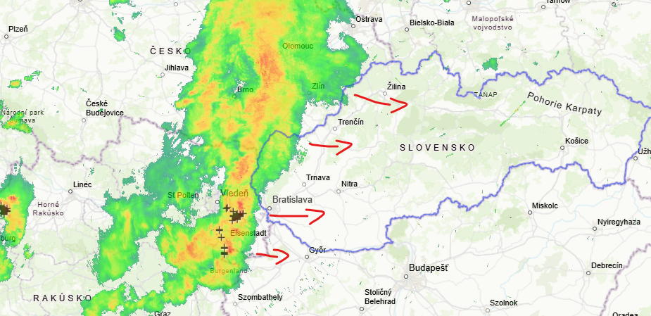 S búrkovou aktivitou je to presne tak, ako sa očakávalo – pred slovenskými hranicami začína slabnúť. Stále však platí, že najvyššia pravdepodobnosť výskytu búrok je v okresoch Bratislava, Dunajská Streda a čiastočne aj Komárno. Aktívnejšie búrky sa budú vyskytovať najmä na rakúsko-maďarskom pohraničí a následne na západe Maďarska.