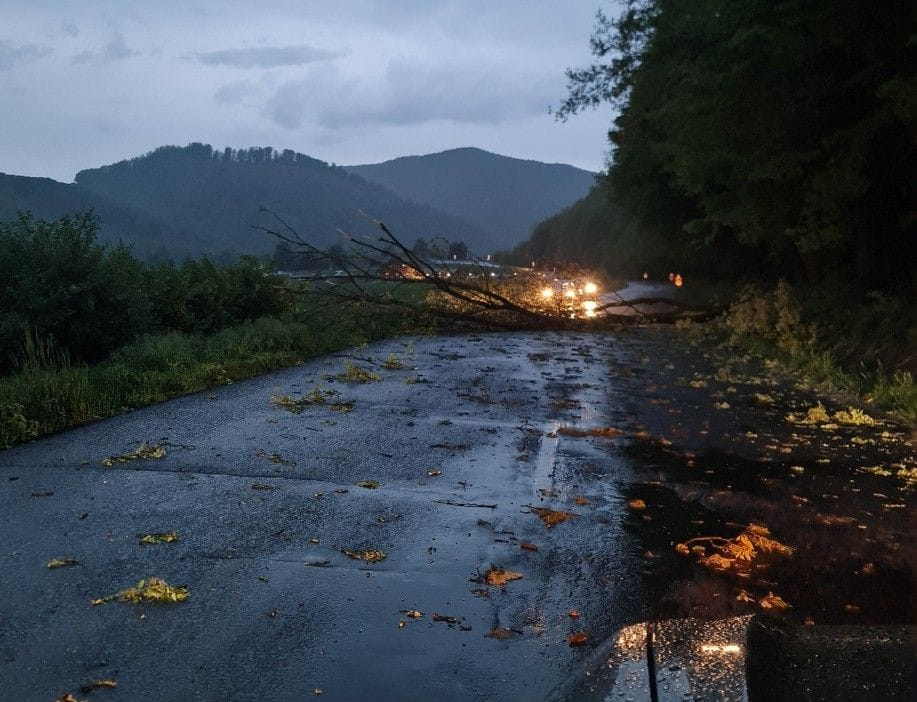 Na strednom Slovensku už riziko krúp kleslo a naopak, vzrástlo riziko silných nárazov vetra. Na niekoľkých miestach popadali konáre, či menšie stromy, ako na ceste z Budče smerom na Čertovskú kolibu.