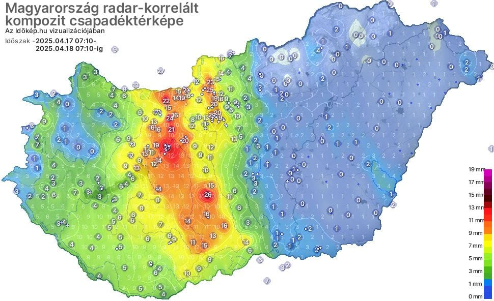 Meteorologický portál Időkép informoval, že búrky s intenzívnym dažďom sa presúvali smerom na severovýchod, pričom východnú polovicu Dunaja a okolia hlavného mesta zasiahlo zatiaľ najviac zrážok. Niekde spadlo aj viac ako 25 mm zrážok.
