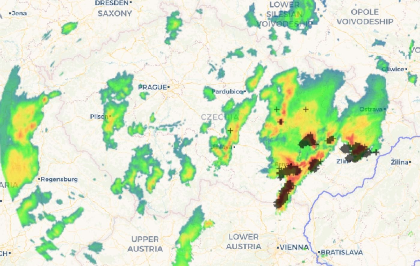 Najsilnejšia búrka – supercela, postúpila na Znojemsko zo severovýchodu Rakúska, ktorá priniesla krúpy o veľkosti 3 cm, informuje ČHMÚ.