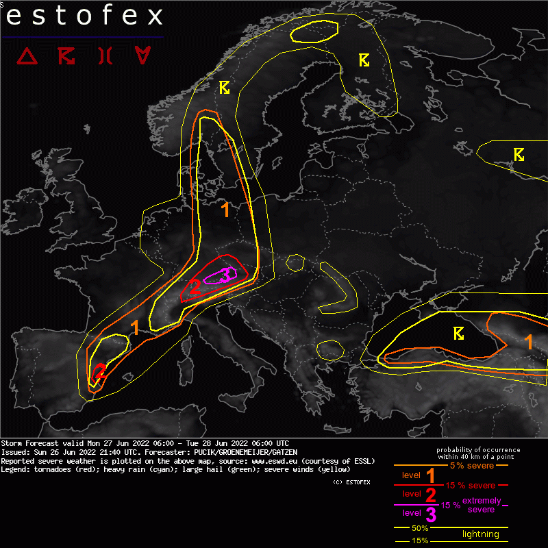 Pred dnešnými búrkami platia výstrahy v mnohých krajinách. Svoje varovanie vydala aj meteorologická služba Estofex, ktorá dokonca pre nemecko-rakúske pohraničie vydala varovanie až najvyššieho 3. stupňa.