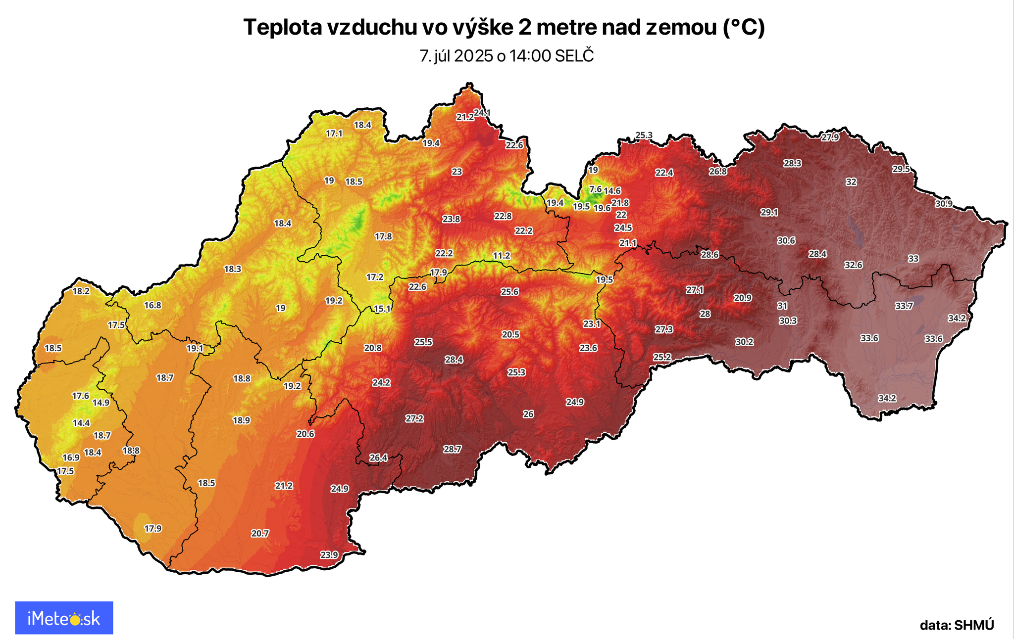 Práve na východnom Slovensku ešte prevláda horúce počasie s teplotami atakujúcimi +35 °C, ktoré vytvárajú ideálne podmienky pre vznik silných búrok, zatiaľ čo v západnej polovici nášho územia teploty neprekračujú +20 °C.