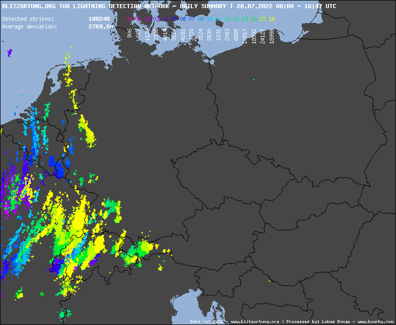 Pomerne búrlivo je na východe Francúzska a predovšetkým v Nemecku, vo Švajčiarsku a na západe Talianska. Búrky tu už priniesli desiatky tisíc bleskov. Celkový počet bleskov prekonal hranicu 100 000 úderov.