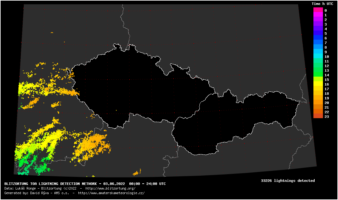 Búrky počas dnešného dňa vystrájali predovšetkým vo Francúzsku a putovali cez Nemecko smerom k Rakúsku a k Česku. Detekcia bleskov zaznamenala už viac ako 100 000 bleskových úderov, pričom je jasné, že ďalšie blesky pribudnú počas noci.