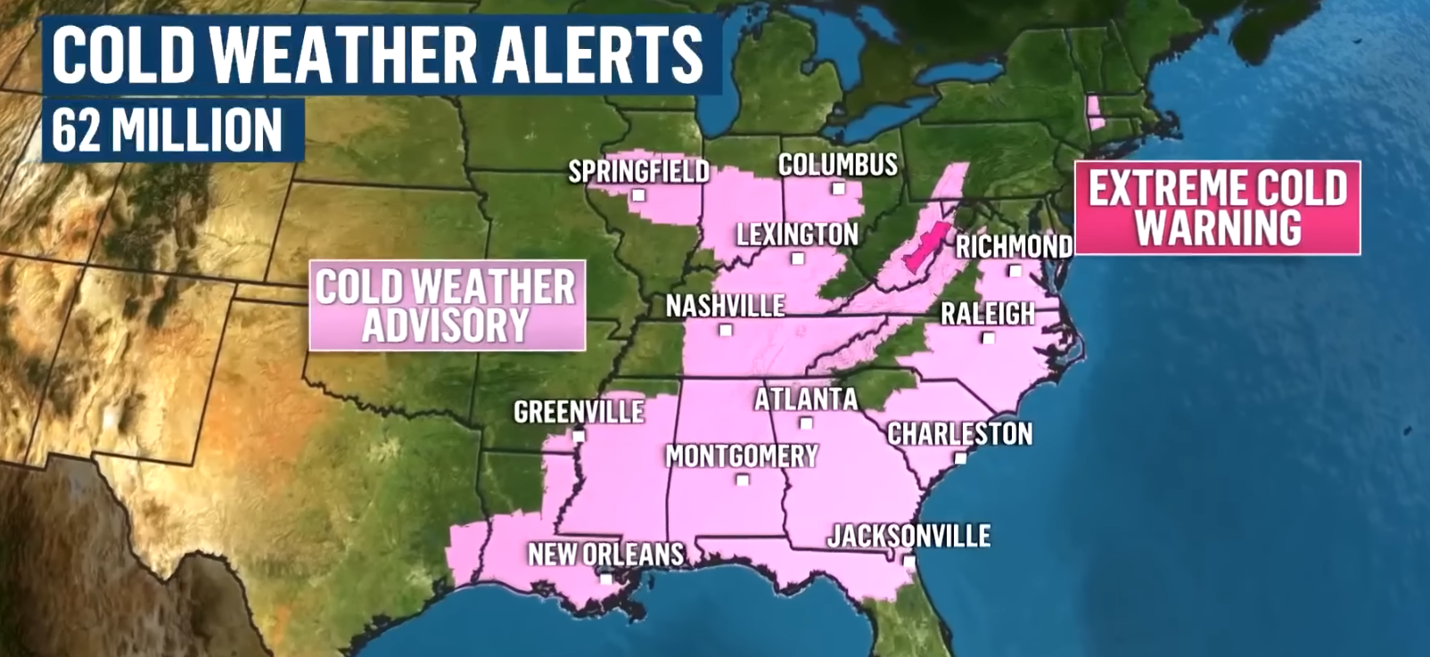 Studený vzduch sa postupne presúva aj na severovýchod a juhovýchod USA. Mínusové teploty sa vyskytli aj v oblastiach, kde je to skôr zriedkavé.