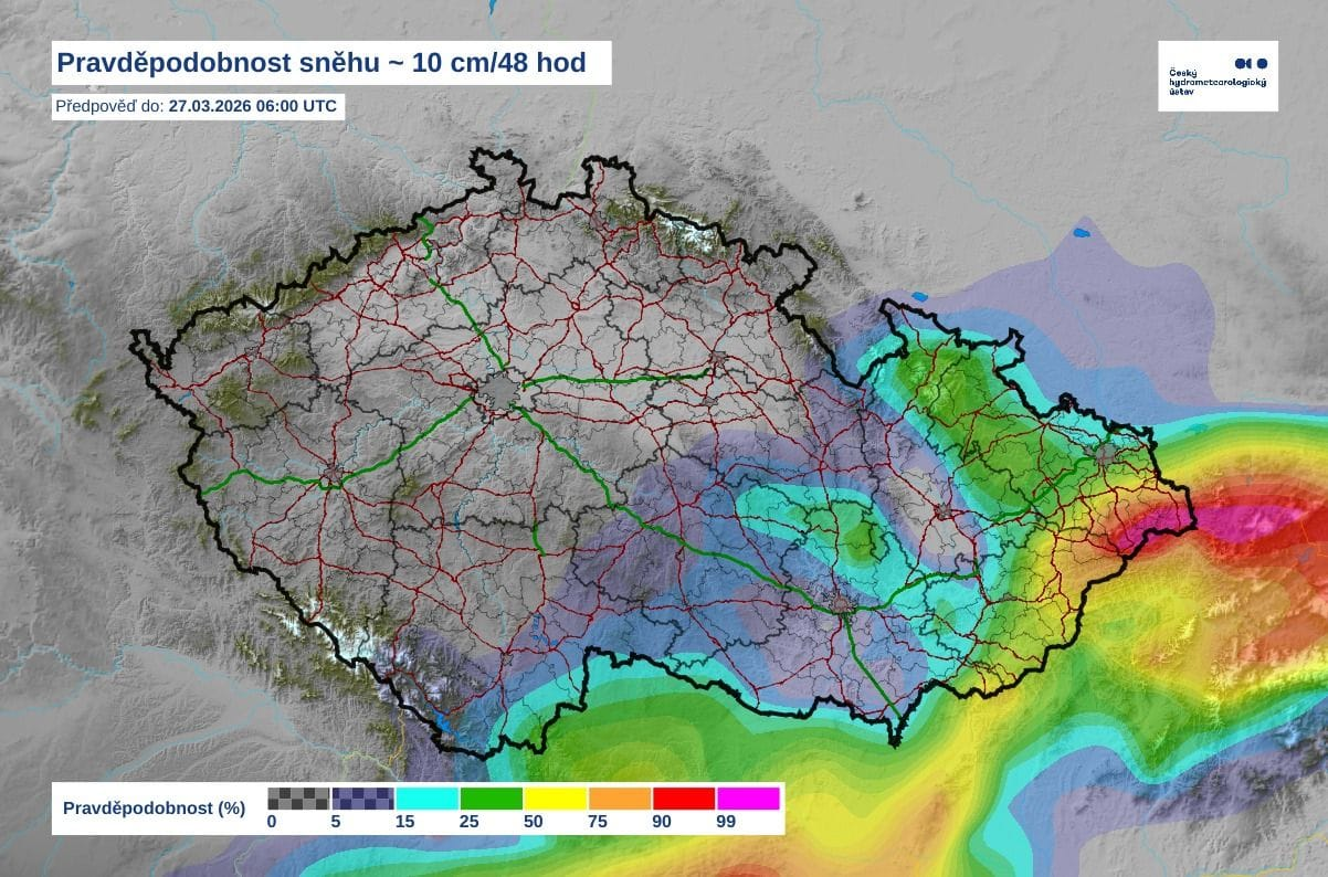 Aktuálne prognózy ČHMÚ naznačujú, že výraznejšie sneženie zasiahne počas štvrtka a piatka najmä najvýchodnejšie regióny Moravy a Sliezska, konkrétne oblasť Beskýd a česko-slovenské pohraničie.