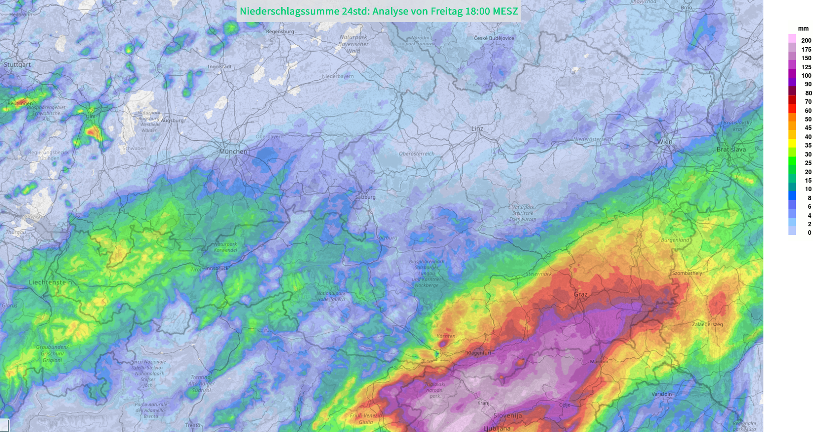 Predpovedné modely udávajú, že v oblasti na pomedzí Rakúska a Slovinska, môže do sobotnej 18. hodiny spadnúť ďalších viac než 150 mm zrážok. V horských oblastiach môže byť toto číslo ešte vyššie.