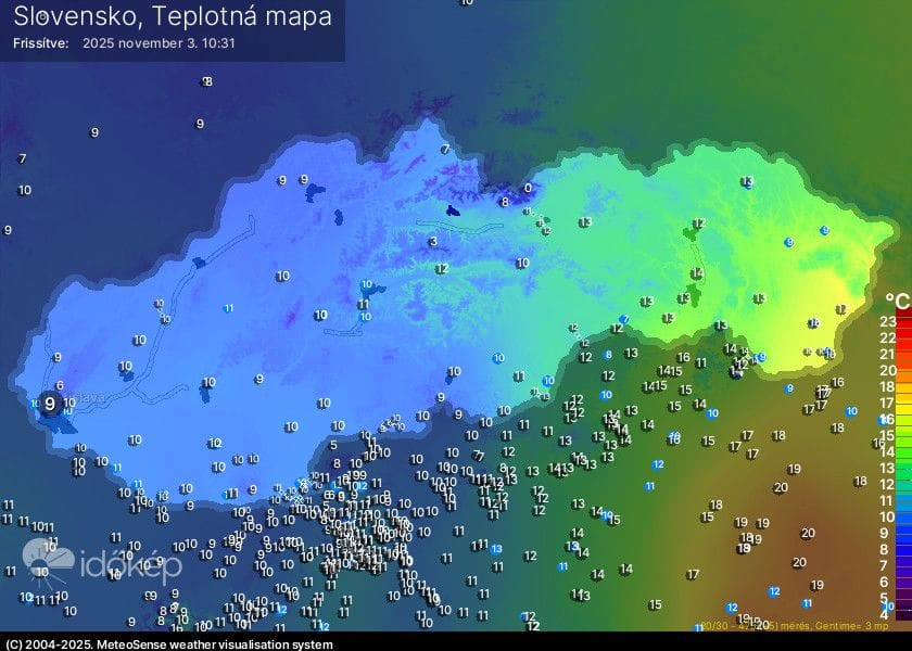 Za frontom sa bude postupne ochladzovať na celom území Slovenska a na aktuálnej teplotnej mape vidíme, že ochladzovať sa už začína aj na strednom Slovensku.