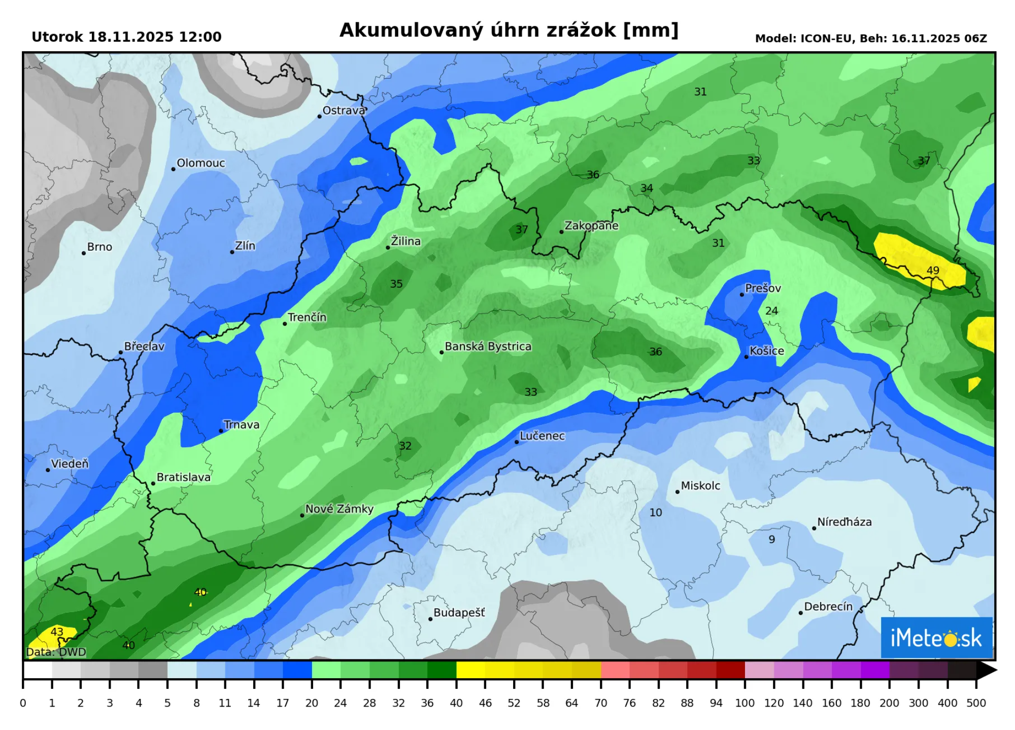 Najnovší beh modelu ICON naznačuje, že zrážky budú plošné a cez 30 mm spadne predovšetkým v oblasti hôr.