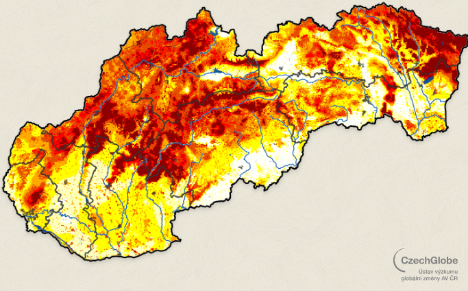 Aktuálne mapy sucha ukazujú rozsiahle oblasti s výrazným deficitom vlahy. Čím je farba na mape červenšia, tým je sucho intenzívnejšie – a z mapy je zrejmé, že zasahuje celé územie krajiny.