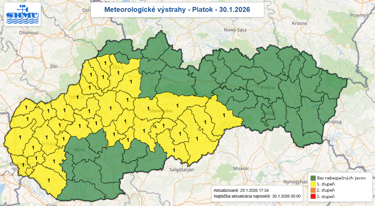 V súvislosti s očakávaným vývojom počasia vydal Slovenský hydrometeorologický ústav výstrahu prvého stupňa pred poľadovicou. Výstraha je v platnosti od štvrtka 29. januára od 17:30 h až do piatka 30. januára do 10:00 h. Týka sa rozsiahleho územia západného, stredného aj severného Slovenska.