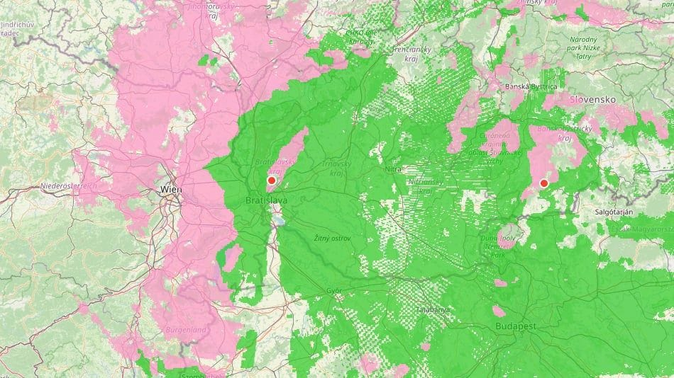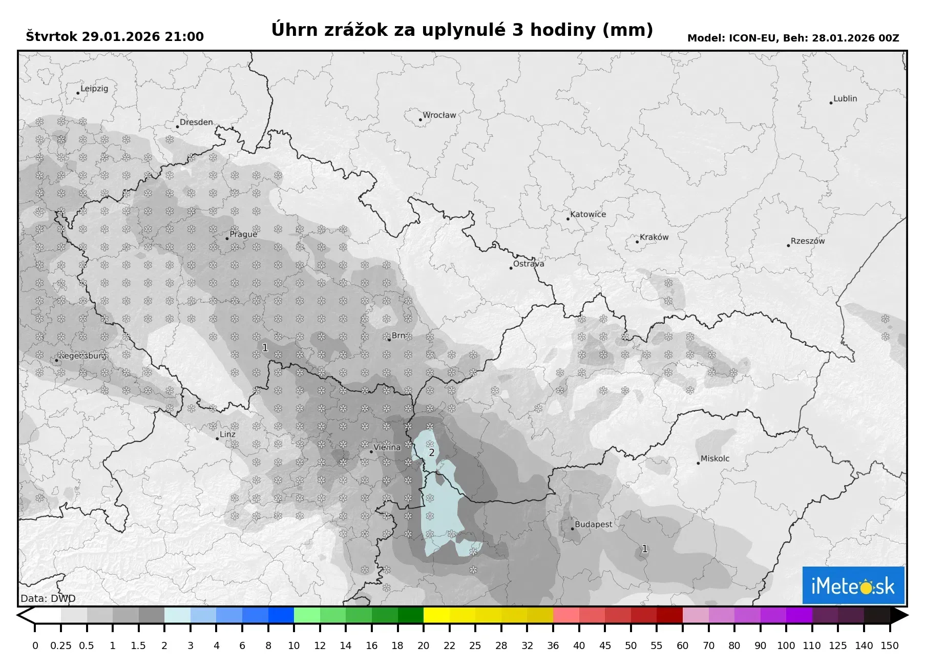 Hneď za našimi hranicami sa však už nachádza studený vzduch a sneží. Sneženie hlási napríklad celá Morava vrátane Brna a sneží aj na východe Rakúska hneď za Viedňou. Sneženie je znázornené fialovou farbou.