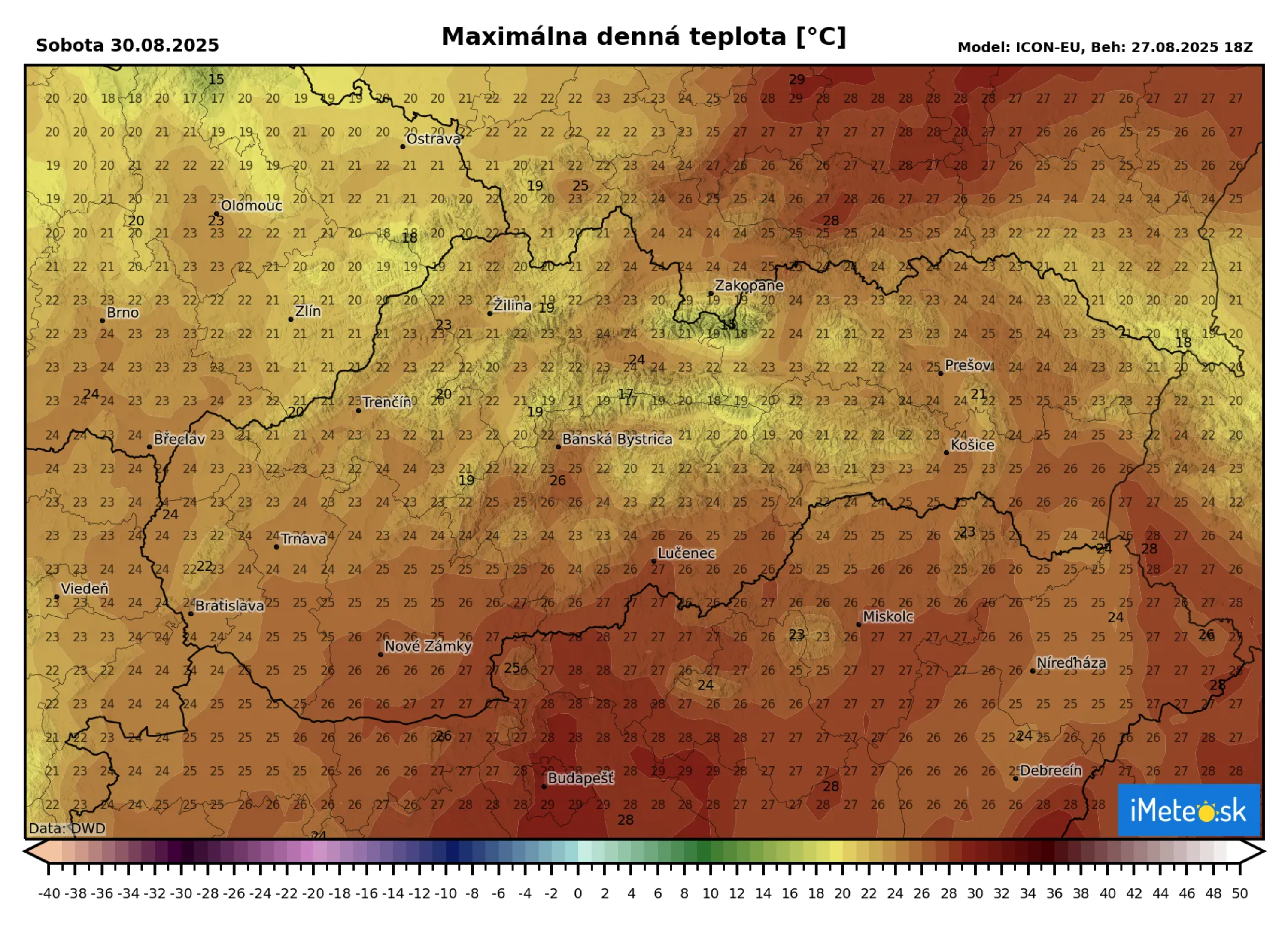Najvyššie teploty dnes dosiahnu +29 °C až +34 °C, na severe miestami okolo +27 °C a pre okresy v Bratislavskom, Trnavskom a Nitrianskom kraji dokonca platia výstrahy 1. stupňa pred vysokými teplotami, ktoré môžu stúpať k +33 až +34 °C.