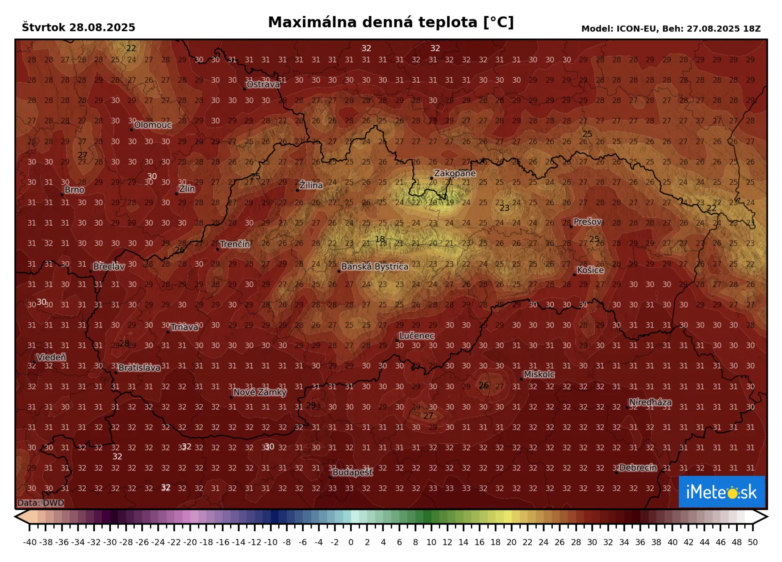 Aj piatok bude ešte horúci, výrazne sa na ňom však podpíše príchod studeného frontu, ktorý do našej oblasti začne postupovať od západu, zatiaľ čo od juhozápadu do karpatskej oblasti bude vrcholiť prílev veľmi teplého tropického vzduchu – výsledkom čoho sa teploty nad +30 °C udržia najmä v južnej polovici nášho územia.