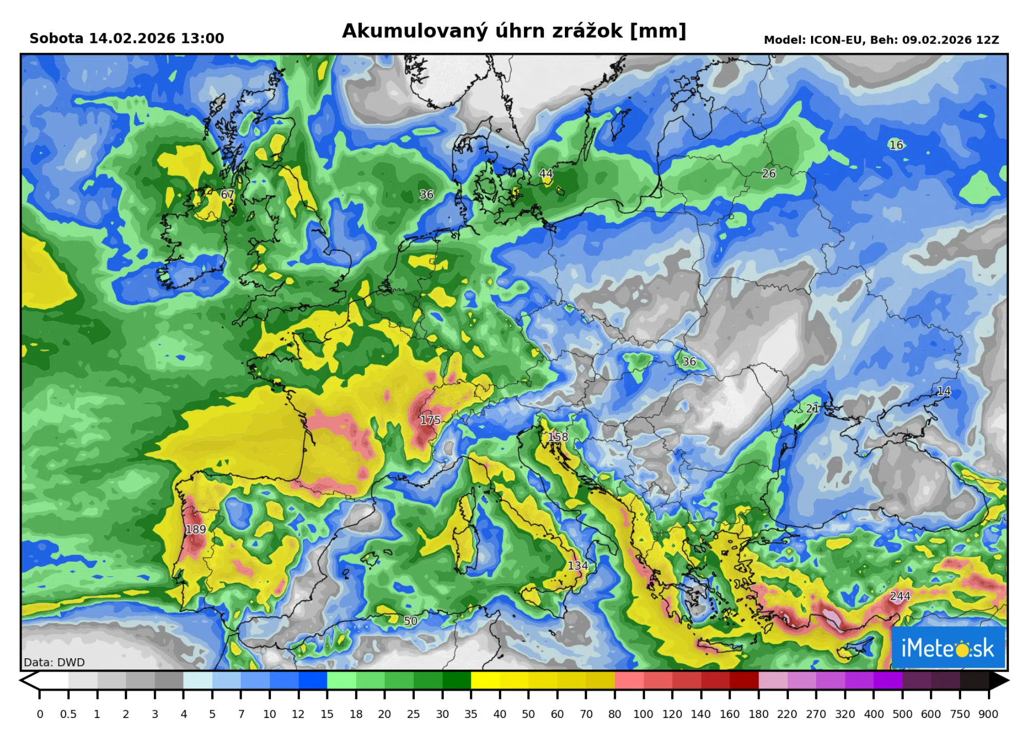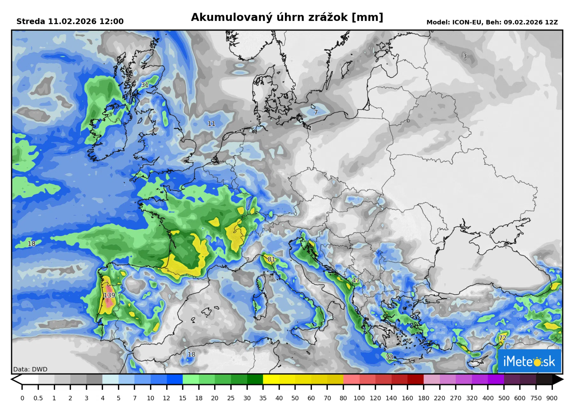Silné západné prúdenie prinesie ďalšiu vlhkosť z Atlantiku, čo sa prejaví predovšetkým v Portugalsku, Španielsku, ale aj vo Francúzsku. Do stredajšieho poludnia by malo spadnúť 30 až 80 mm zrážok, v Portugalsku lokálne až do 150 mm.