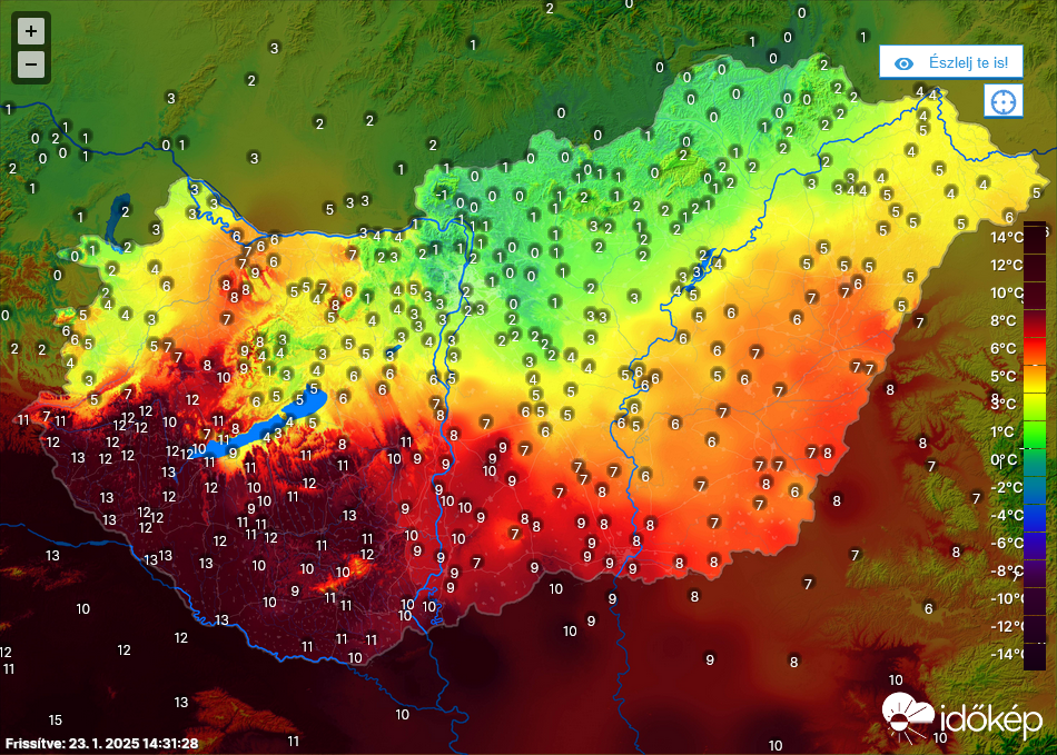 Kým na Slovensku sa štvrtkové teploty pohybujú od -1 °C do +6 °C, na juhozápade Maďarska teploty dosiahli +13 °C. Podľa portálu Idokep túto hodnotu namerali stanice v Csesztreg, Csurgó, či v Gyékényes.