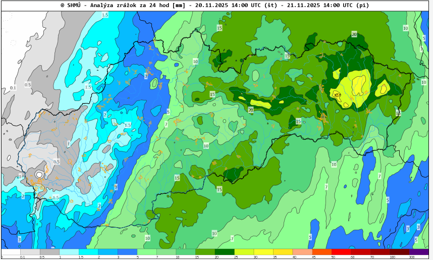 Za uplynulých 24 hodín spadlo najviac zrážok v oblasti Slanských vrchov a Nízkych Beskýd, kde úhrn na niekoľkých miestach prekročil už 30 mm. 1 mm snehových zrážok zodpovedá 1 cm snehu.