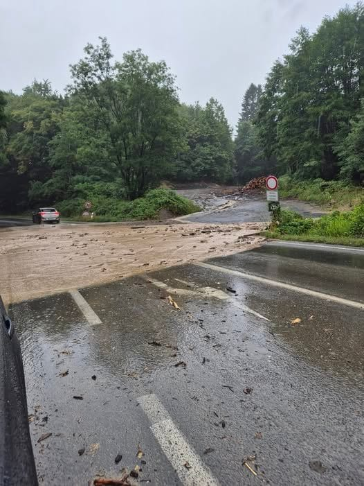 Na cestu medzi Pílou a Lučencom voda z okolitých kopcov naplavuje drevo a kamene na hlavnú cestu.
