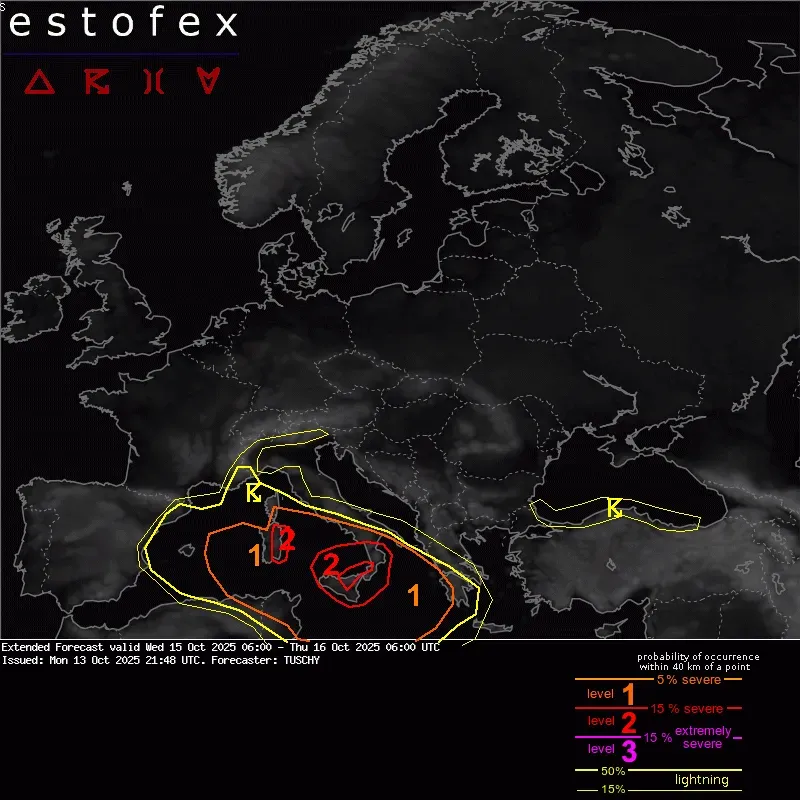 Služba ESTOFEX vydala výstrahu pre dnešný deň, v stredu 15. októbra 2025, a to od 8:00 do zajtra 16. októbra od 8:00 h, kde bola vydaná výstraha 2. stupňa pre východnú Sardíniu a ďalšia pre Sicíliu a časti južného Talianska, predovšetkým kvôli nadmerným zrážkam s úhrnom do 300 mm.