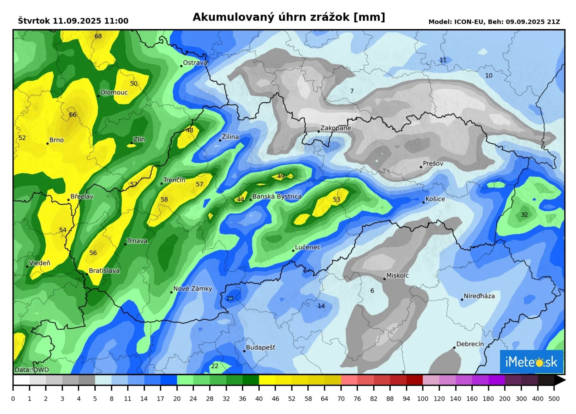 Podľa aktuálnych dát by malo do štvrtkového rána na Slovensku spadnúť plošne 30 až 50 mm zrážok. Na náveternej strane pohorí, najmä v oblasti Malých a Bielych Karpát či v orograficky exponovaných častiach západného Slovenska, by mohlo spadnúť aj do 70 mm zrážok. Takéto množstvo už predstavuje významné riziko lokálnych povodní a zosuvov pôdy.