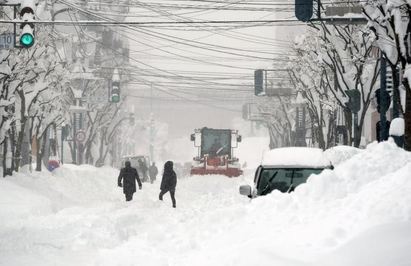Japonská meteorologická agentúra označila studený front, ktorý prináša do Japonska masívne sneženie, za najsilnejší za niekoľko rokov. Najviac zasiahnutý bol ostrov Hokkaido, najsevernejší hlavný ostrov Japonska a pobrežie Japonského mora, kde napadlo neuveriteľné množstvo snehu.