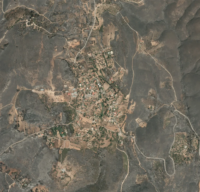 Vothonas, dedina neďaleko Varnavasu, je podobne obklopená čiernou, popolavou krajinou, takmer úplne spálenou lesným požiarom.