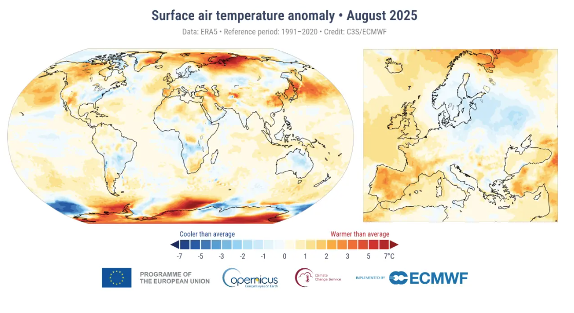 Globálne údaje programu Copernicus ukazujú, že august bol tretím najteplejším po rokoch 2023 a 2024, no zároveň sa objavili rozsiahle chladné oblasti na všetkých kontinentoch. Pozitívna teplotná anomália sa takmer vrátila k historickému priemeru.