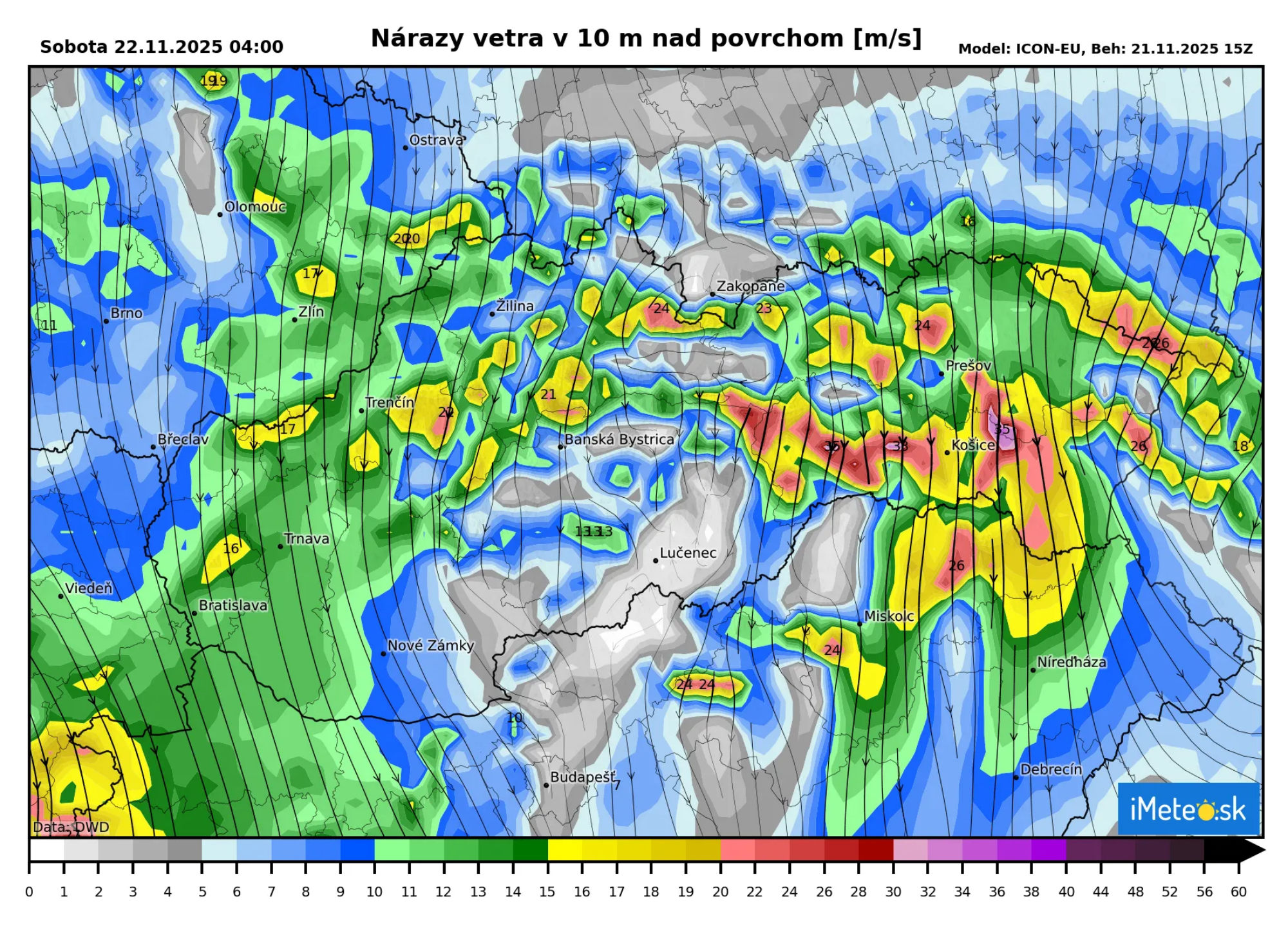 Predpoveď vetra očakáva, že najhorší vietor sa v oblasti východného Slovenska očakáva od polnoci do sobotňajšieho rána 6:00.