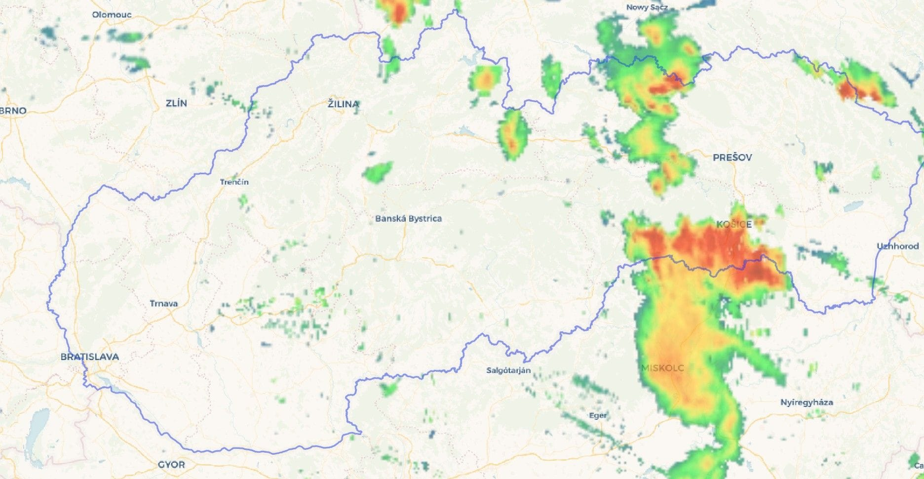 Nad naše územie sa od juhu blíži vlna búrok, ktorá postupuje do oblasti Košíc zo susedného Maďarska, kde už búrky priniesli niekoľko problémov. Vyskytuje sa tu silný, nárazový vietor a pomerne výrazné zrážky, ktoré môžu spôsobiť problémy.