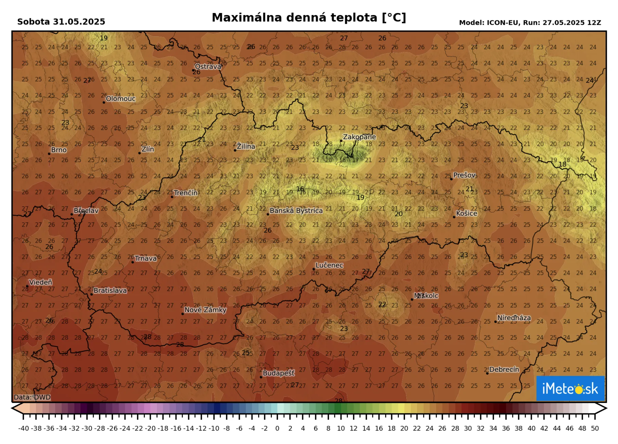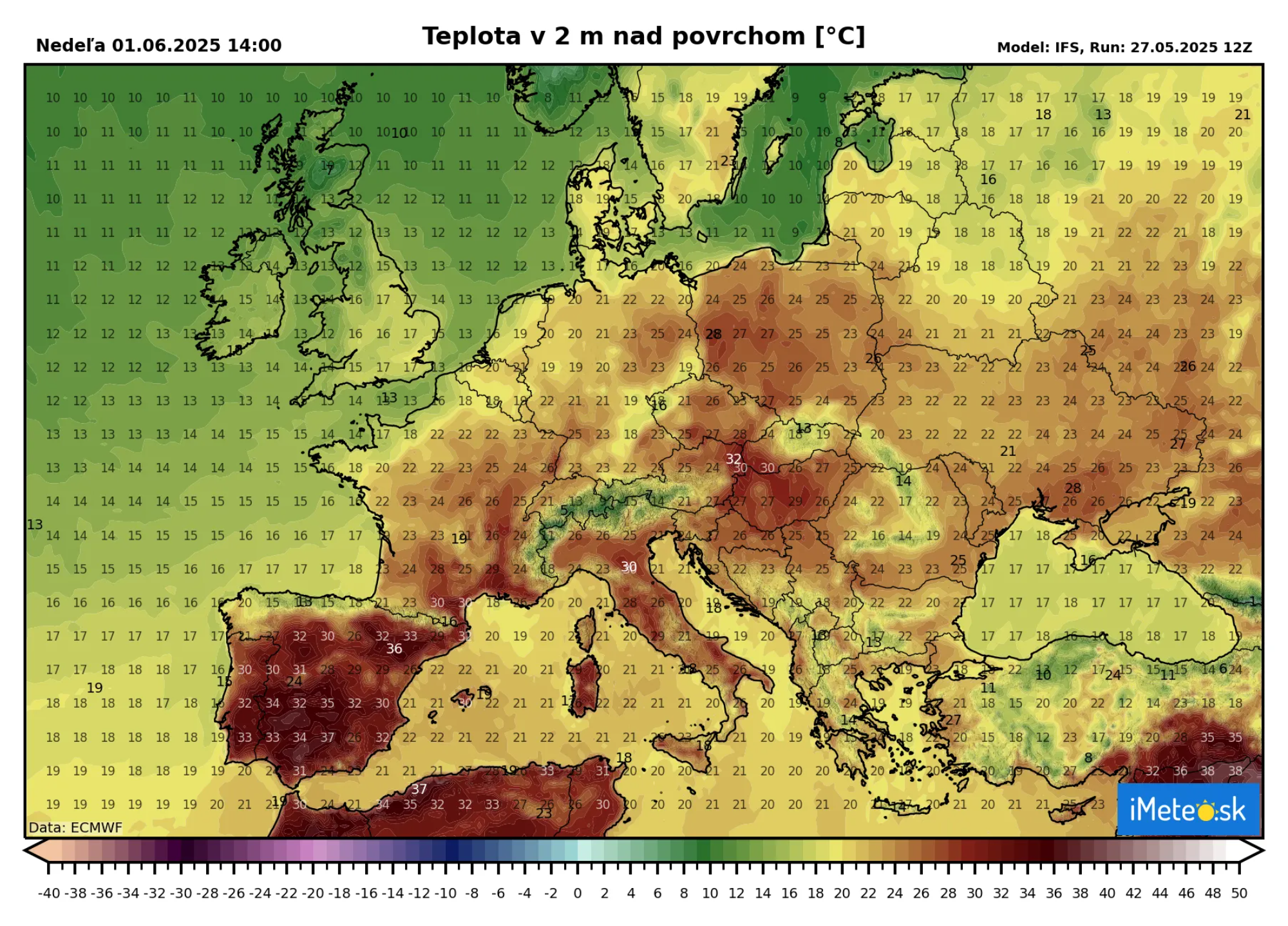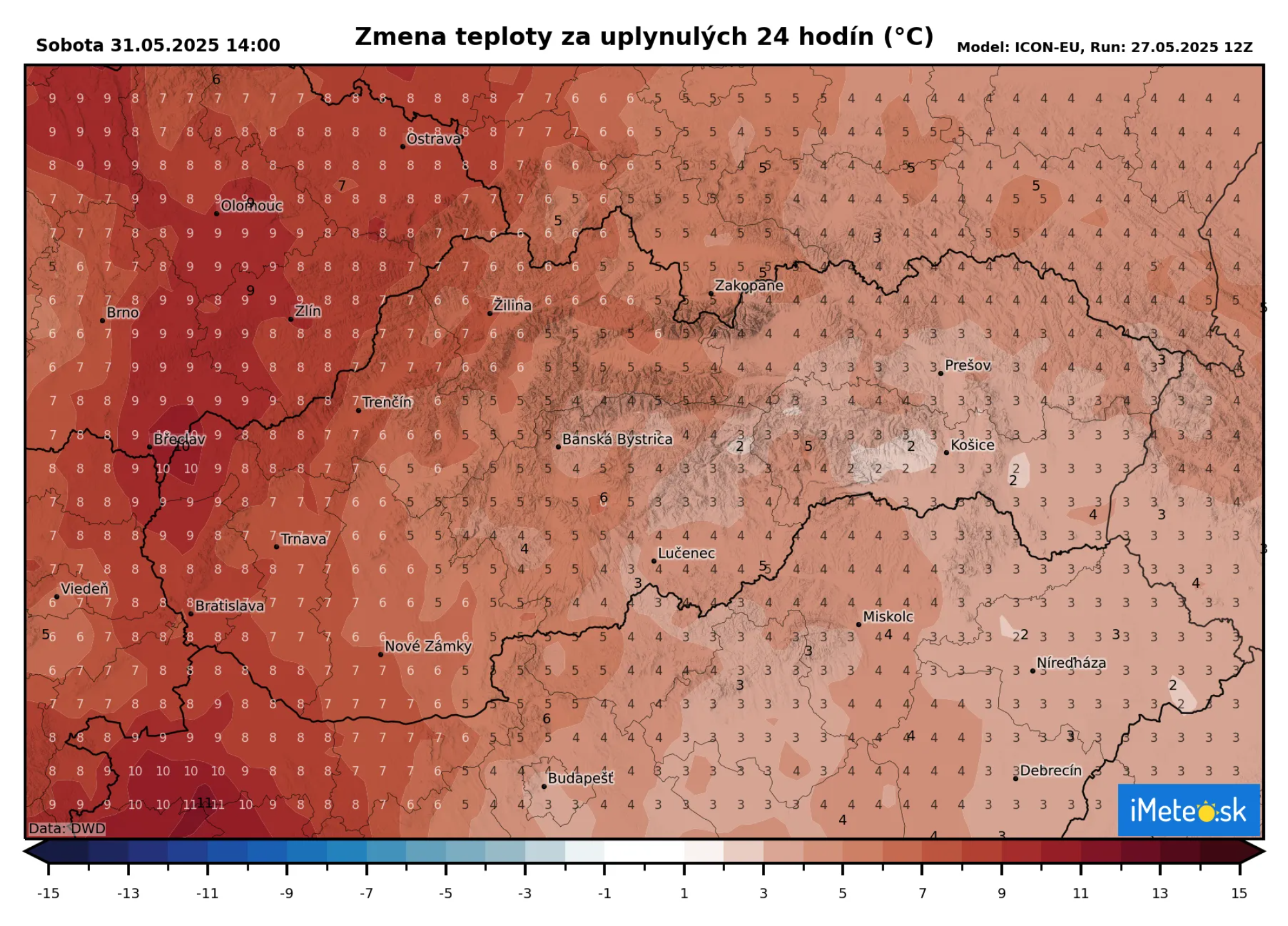 Hneď však dodávame, že v nedeľu to bude o čosi komplikovanejšie. Popoludní nás totiž začne ovplyvňovať studený front. Model ECMWF očakáva, že to bude až podvečer a teploty by tak mohli vystúpiť až nad +30 °C, no nemecký model ICON očakáva, že front príde o niekoľko hodín skôr a na juhozápade sa stihnú teploty dostať len na úroveň +30 °C.