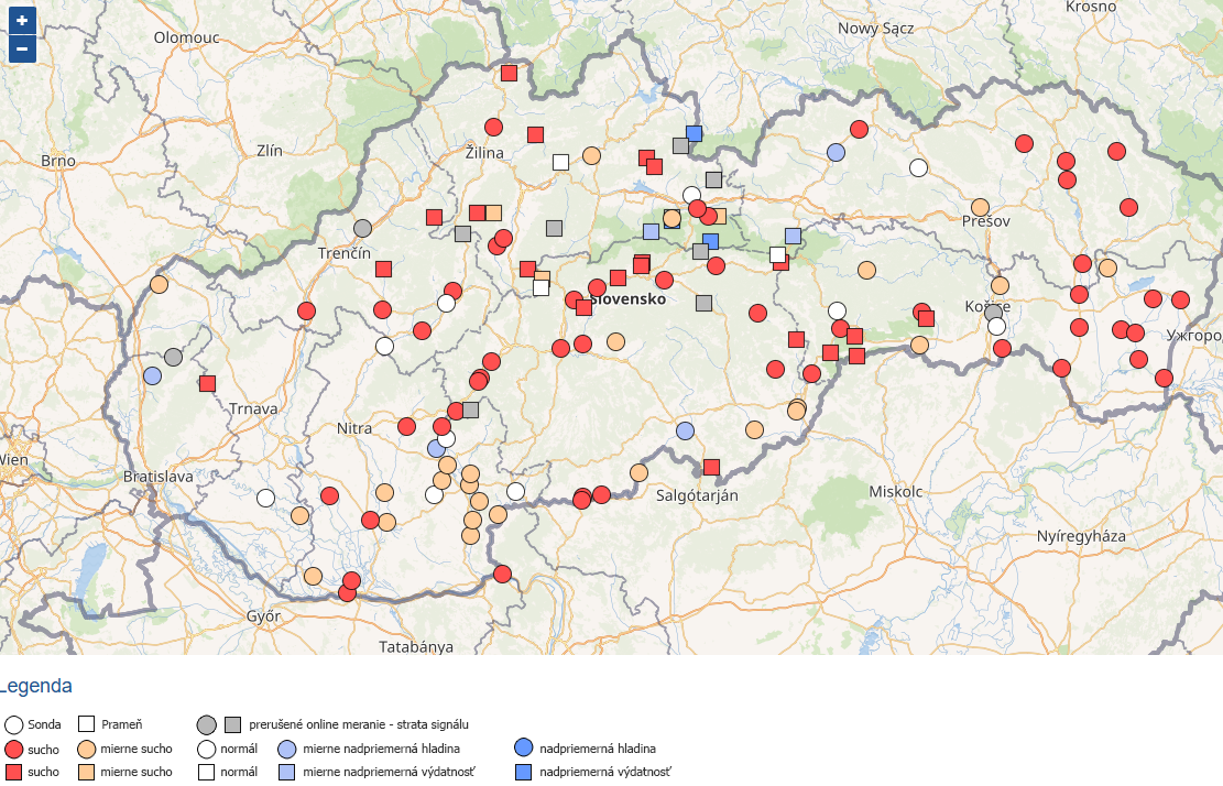 Mapa výšky podzemných vôd jasne ukazuje, že sucho a podpriemerná hladina podzemných vôd je prakticky na celom území Slovenska.