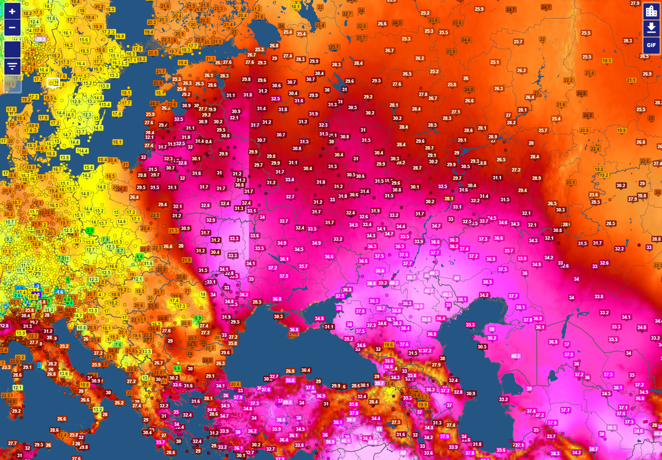 V hlavnom meste Kyjev sa dnes teplota o 15:00 dostala až na +33,6 °C a čím východnejšie pôjdeme, tým teplejšie. Napríklad v Chersone je +36,8 °C a v meste Kryvyi Rih, sa teplota vyšplhala až na +37,3 °C. Ešte teplejšie je na Kryme, kde sa teploty pohybujú na maximálnych hodnotách okolo +38 °C. O čosi chladnejšie je však na pobreží Krymu, kde teplota klesá pod +30 °C v dôsledku búrok.