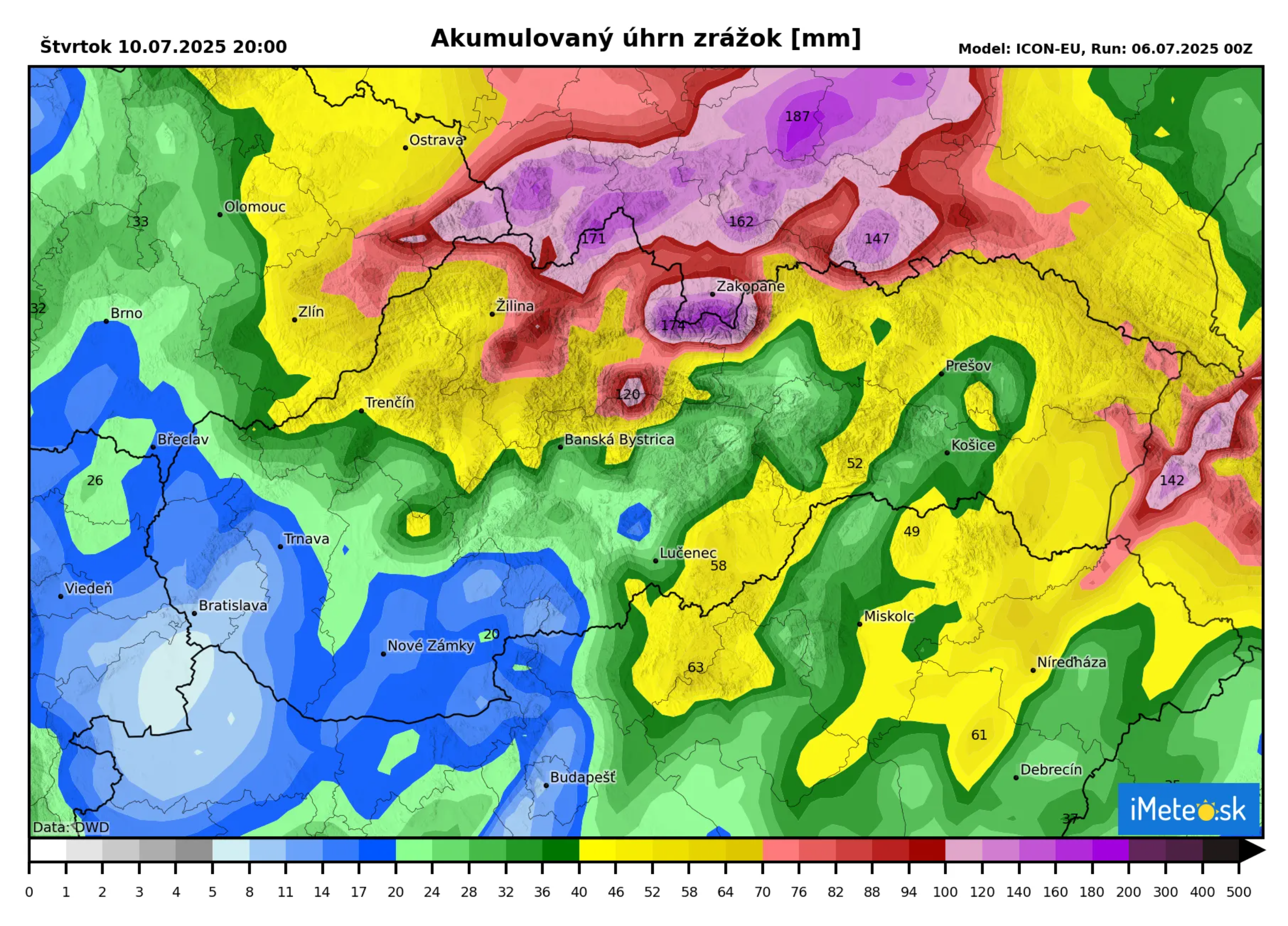 Zrážky tak budú prichádzať od severu a zasiahnu predovšetkým severné návetria hôr, kde bude pršať výraznejšie. Modely nám sľubujú najviac zrážok vo Vysokých Tatrách a na Orave, kde by sa úhrny mohli vyšvihnúť až na 170 mm.