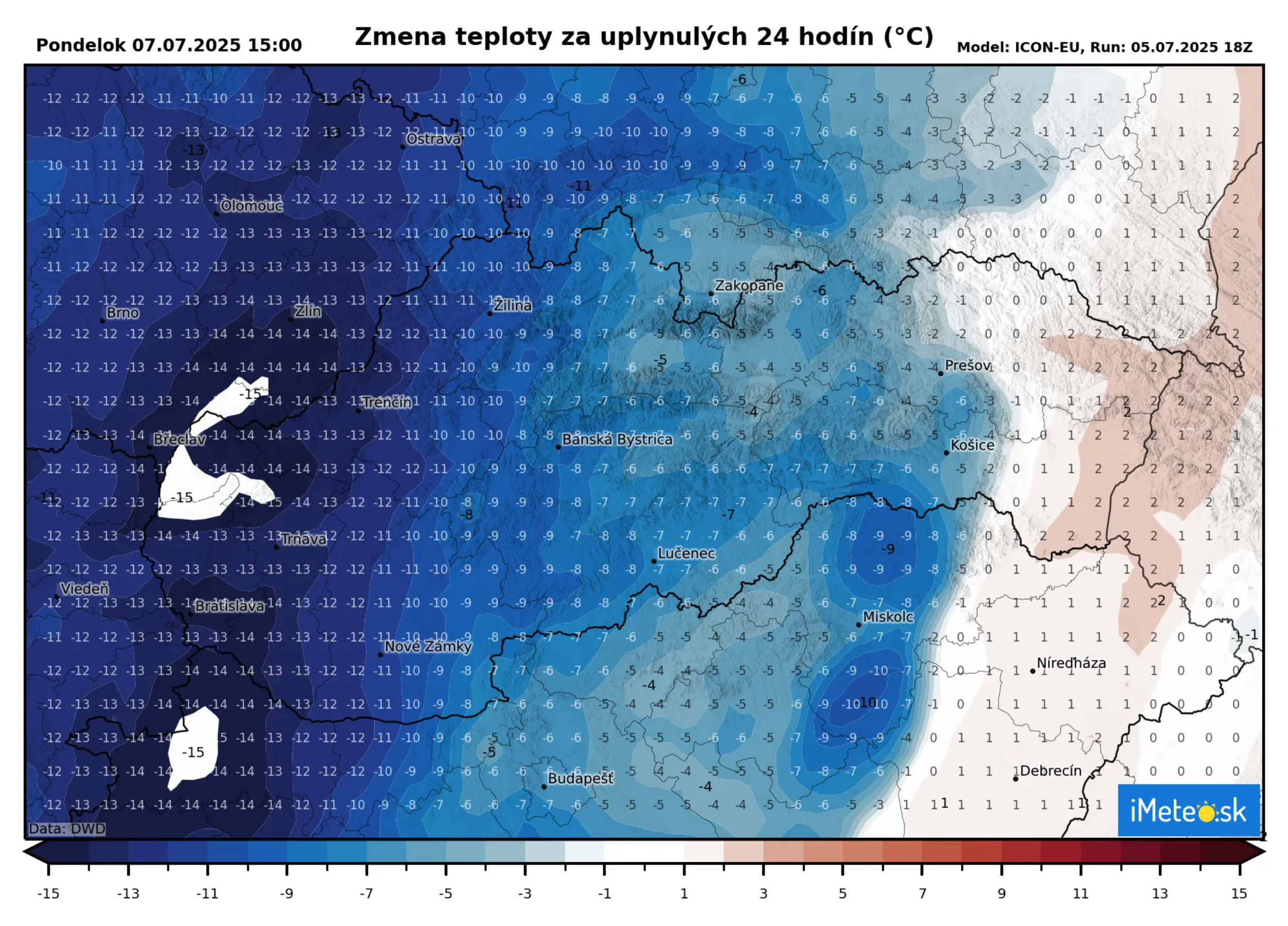 Čo sa týka Slovenska, tak u nás dôjde za 24 hodín k ochladeniu o 15 °C. Najviac sa ochladí na krajnom západe Slovenska.