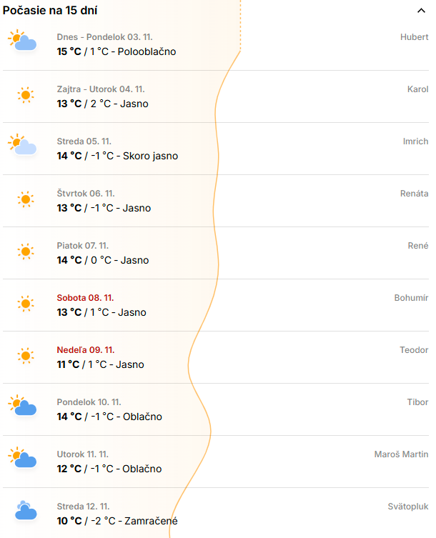 Pred nami sú slnečné dni, ktoré prinesú na november veľmi príjemné teploty. Tie sa budú pohybovať v intervale od +8 až do +15 °C. V noci však bude chladno. Pri vyjasnení budú teploty klesať na +6 až -1 °C.