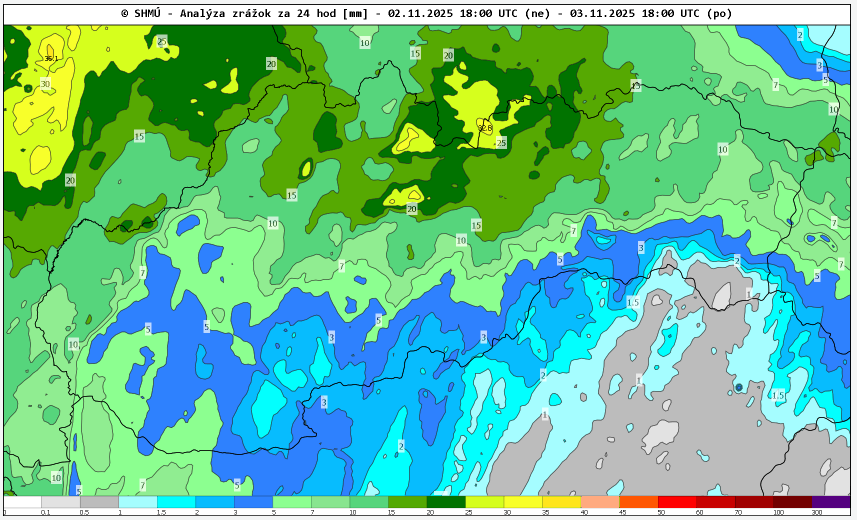 Začiatok nového týždňa a prvý pracovný deň v tomto mesiaci priniesol na väčšinu nášho územia upršané počasie, ktoré prinieslo najvýdatnejšie zrážky do severných oblastí Slovenska. Tu počas dnešného dňa spadlo od 10 do 30 mm zrážok, ale nájdeme aj oblasti, kde celkový zrážkový úhrn za uplynulých 24 hodín prekročil až 30 mm.