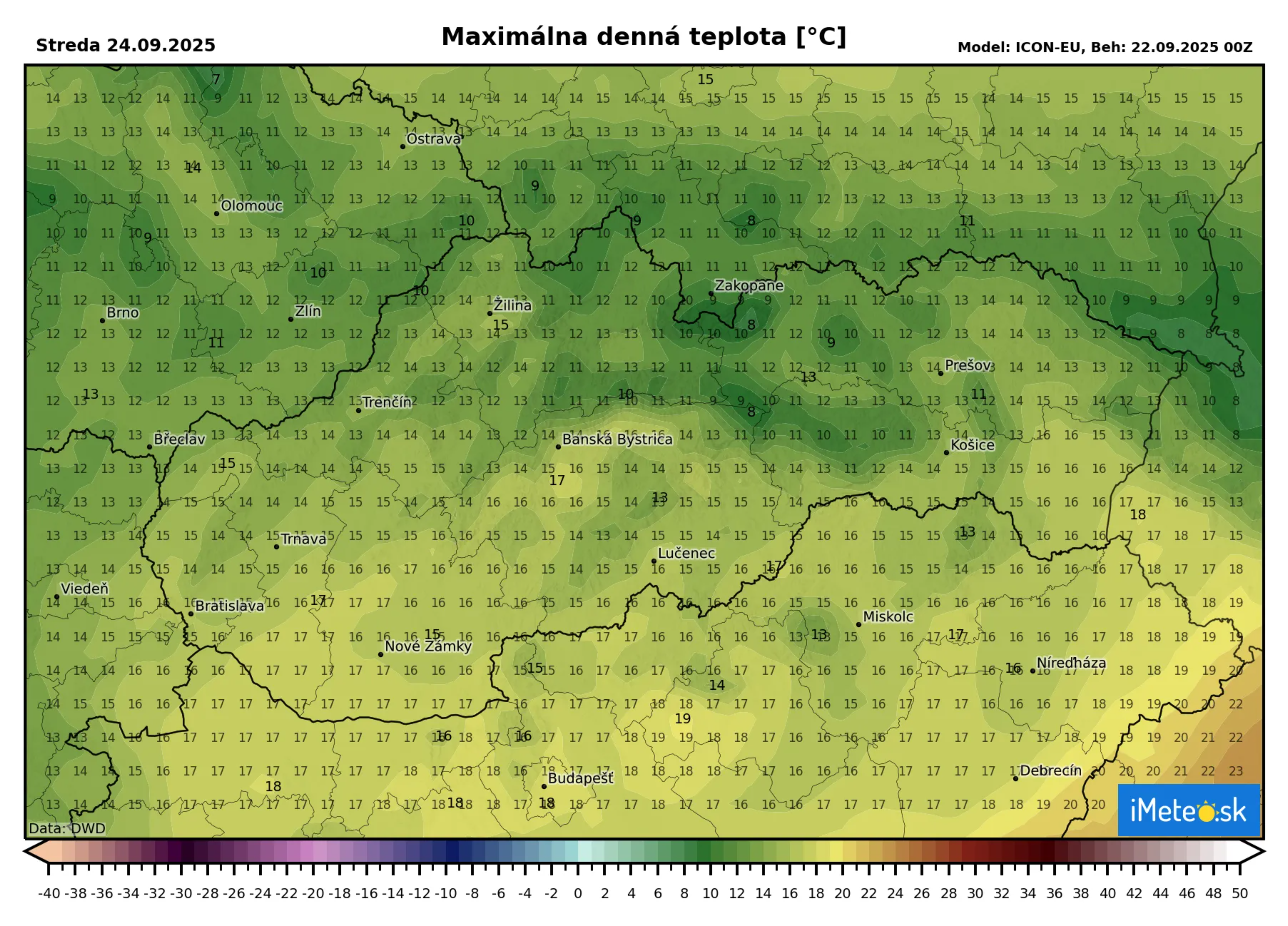 Zatiaľ čo dnešné maximálne teploty sa na našom území dostali na +24 až +30 °C, tak zajtrajšie teploty už budú výrazne nižšie. Maximálne teploty by sa mali pohybovať len od +15 do +23 °C. Na severe bude ešte chladnejšie a tepoty sa môžu pohybovať len medzi +10 až +15 °C.